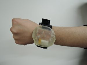 選手用デバイスは選手が上腕部にバンドで装着する.プレイ中の接触で危険の及ばないよう砲弾型のデザインとした.観客からの応援を受信すると応援音声を骨伝導ヘッドホンによって再生し,装着者を応援する.骨伝導ヘッドホンから流れる応援音声はスタジアムでの実際の声援であり,ブラインドサッカーボールから発する鈴の音の音像定位に使われる2kH以上をカットする加工を施した.