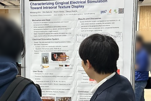 (2026/4/2修正)2026年3月21日~25日にかけて韓国大邱広域市展示コンベンションセンター(EXCO)にて開催されたIEEE VRにおいて,修士課程2年のWoosang Kimさんがポスター発表を行いました.電気刺激を用いた食感生成・変容に関する研究です. Woosang Kim, Sho Sakurai, Koichi Hirota and Takuya Nojima, “Characterizing Gingival Electrical Stimulation Toward Intraoral Texture Display,” Proceedings of IEEE VR, Poster, Booth ID: 251, 2026.